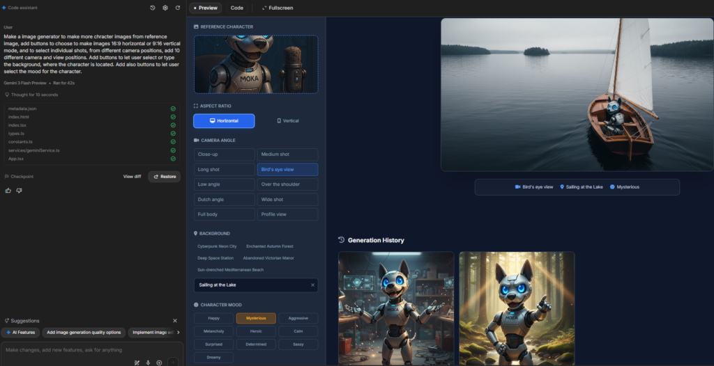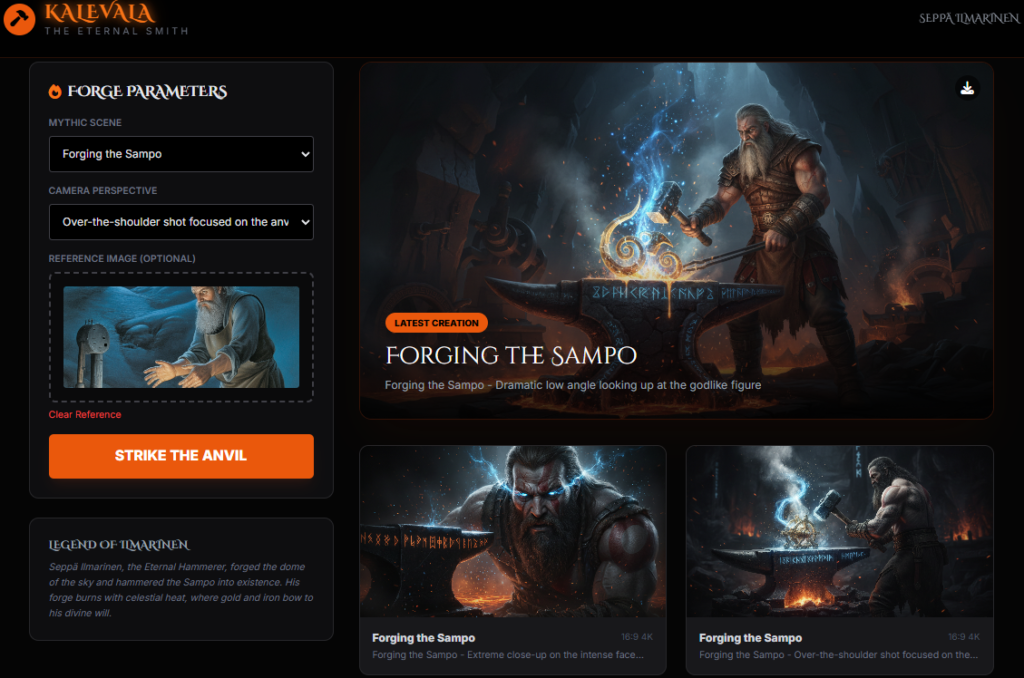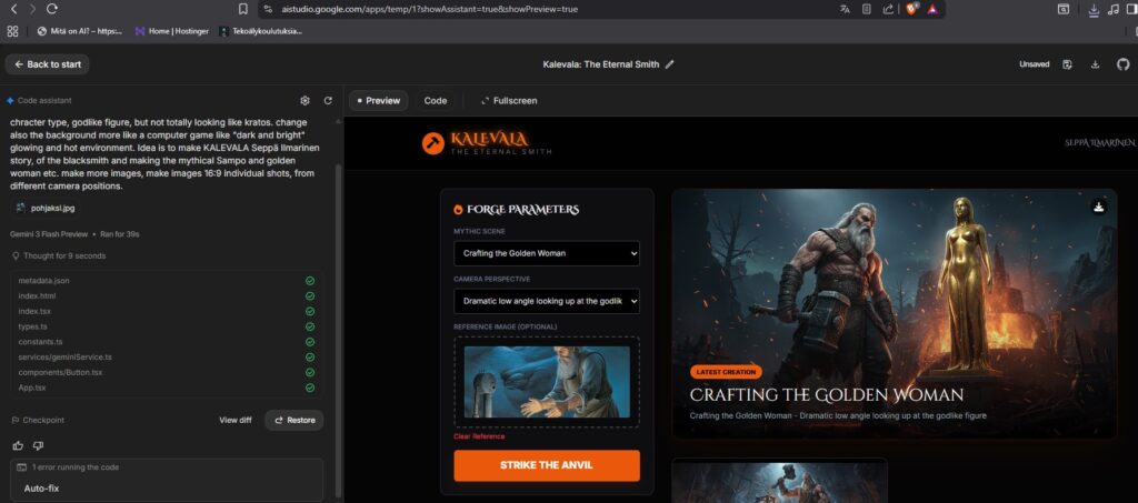 Kokeilin luoda Google AI studio työkalun avulla uuden Web-sovelluksen, jonka avulla voi helposti luoda esim. Kalevalan seppä Ilmarisen tyylisiä kuvia. (Koodia muuttamalla, tietysti voi valita muunkin aiheen)