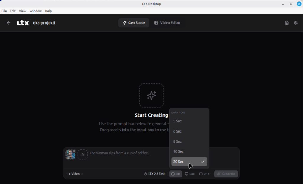 LTX Desktopin avulla voi generoida jopa 20 sekuntia pitkiä videoklippejä, omalla koneella.